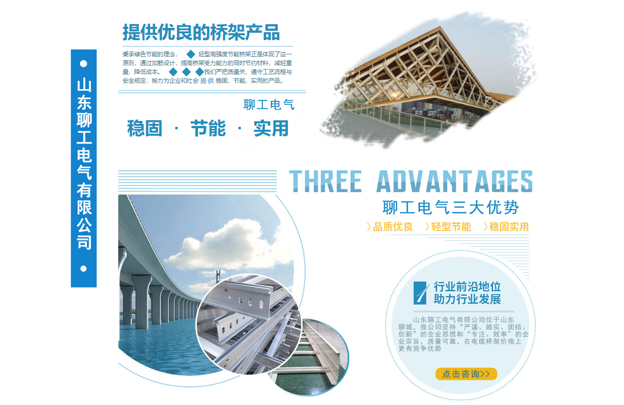 山東聊工電氣有限公司位于山東聊城,是一家銷售各類橋架的公司,公司主營鍍鋅防火噴塑橋架,鍍鋅防火電纜橋架 ,不銹鋼電纜橋架,熱浸鋅電纜橋架,鋁合金電纜橋架,熱鍍鋅電纜橋架,梯式電纜橋架等我公司堅持“嚴謹、踏實、團結、創新”的企業思想和“專注、效率”的企業宗旨,質量可靠,在電纜橋架價格上更有競爭優勢。公司追求品質,配有研發人員,進行產品的改革和創新,服務先進走出了一條富有企業特色的可持續化發展之路!    我公司鄭重向你承諾:保證最好的質量,以低的價格,完善的售后服務,來答謝新老客戶??商崆半娫捖撓?。...